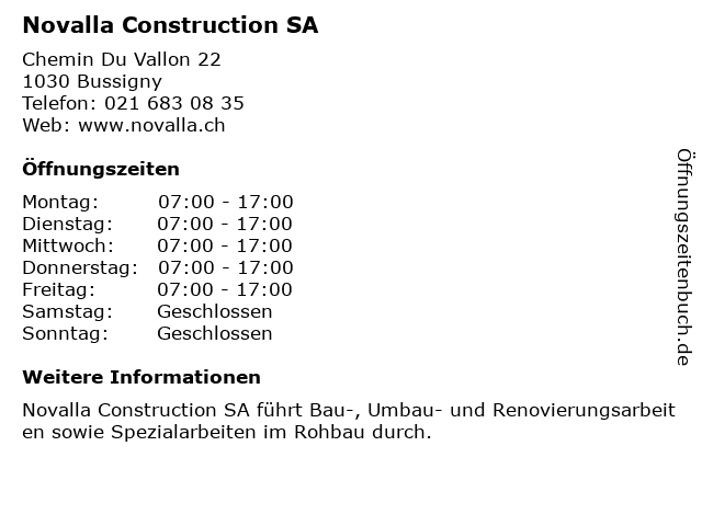 | Öffnungszeiten Novalla Construction SA in Bussigny anzeigen | |
