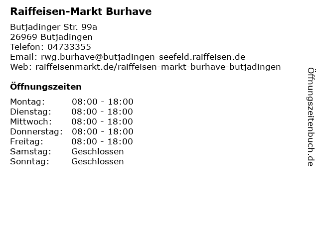 | Öffnungszeiten Raiffeisen-Markt Burhave in Butjadingen anzeigen | |