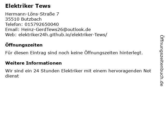 | Öffnungszeiten Elektriker Tews in Butzbach anzeigen | |