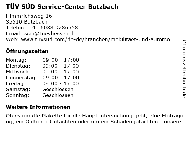 Branchen & Suchbegriffe zu TÜV SÜD Service-Center Butzbach:abgasuntersuchung, center, hauptuntersuchung, kfz, oldtimergutachten, service, süd, tüv |