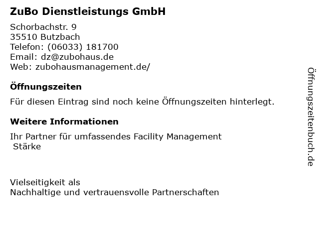 | Öffnungszeiten ZuBo Dienstleistungs GmbH in Butzbach anzeigen | |