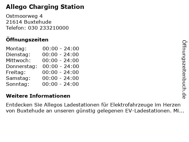 | Öffnungszeiten Allego Charging Station in Buxtehude anzeigen | |