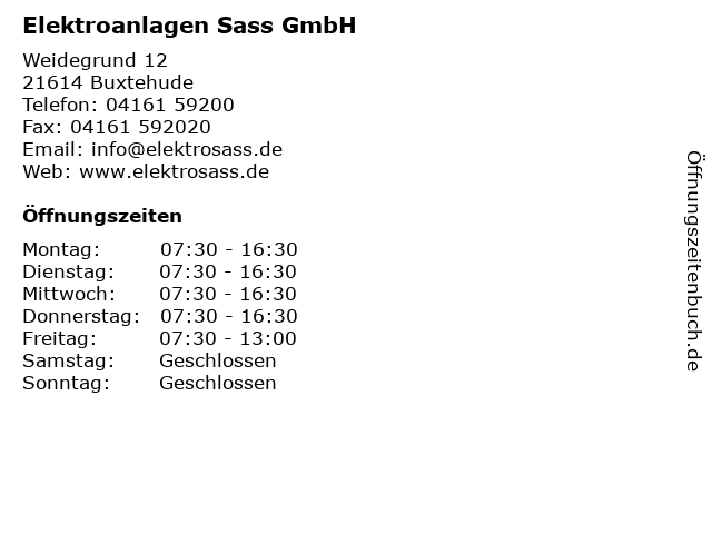 | Öffnungszeiten Elektroanlagen Sass GmbH in Buxtehude anzeigen | |