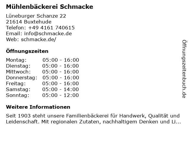 | Öffnungszeiten Mühlenbäckerei Schmacke in Buxtehude anzeigen | |