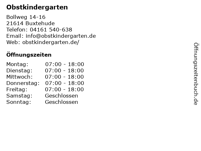 | Öffnungszeiten Obstkindergarten in Buxtehude anzeigen | |