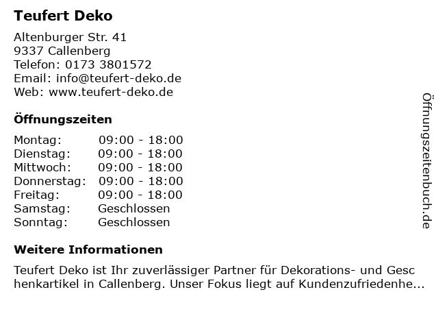 | Öffnungszeiten Teufert Deko in Callenberg anzeigen | |