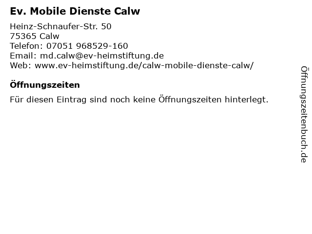 | Öffnungszeiten Ev. Mobile Dienste Calw in Calw anzeigen | |