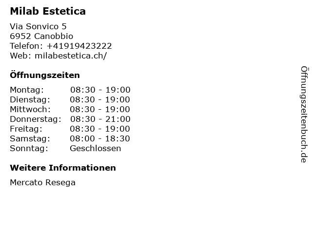 | Öffnungszeiten Milab Estetica in Canobbio anzeigen | |