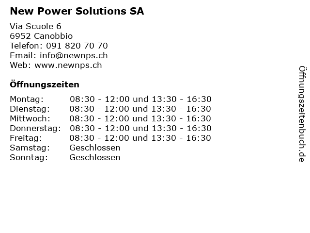 | Öffnungszeiten New Power Solutions SA in Canobbio anzeigen | |
