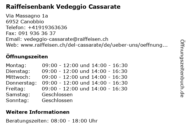 1 Raiffeisenbank del Cassarate - (Bankomat Filiale) (Entfernung: 0,01 km) Via Massagno 1a, 6952 Canobbio 2 Raiffeisenbank del Cassarate (Bancomat - Geldautomat) (Entfernung: 0,65 km) Via Cantonale 42, 6949 Comano 6 |