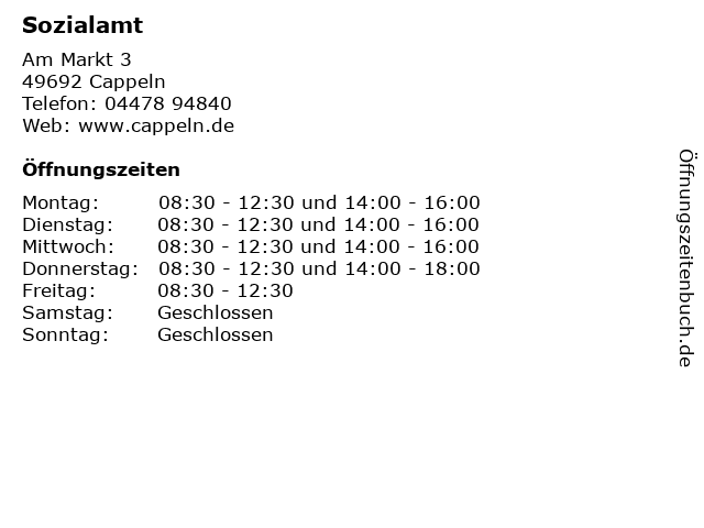 | Öffnungszeiten Sozialamt in Cappeln anzeigen | |