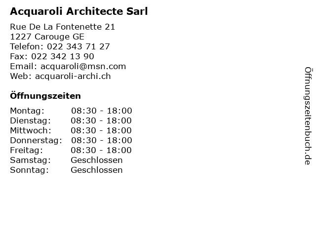 | Öffnungszeiten Acquaroli Architecte Sarl in Carouge GE anzeigen | |