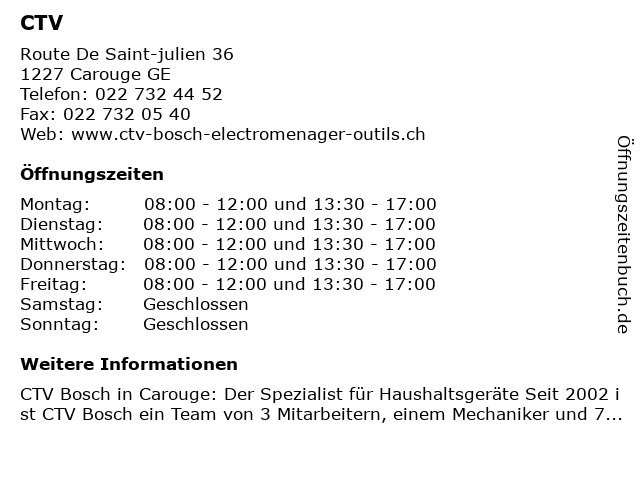 Öffnungszeiten CTV in Carouge GE anzeigen | |