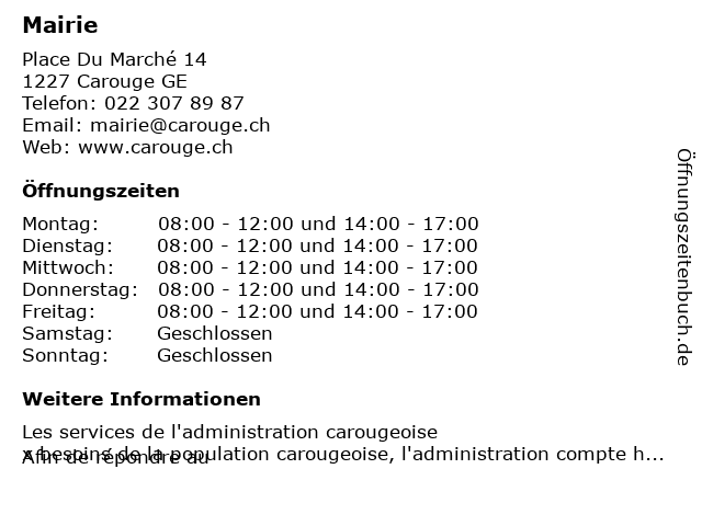 | Öffnungszeiten Mairie in Carouge GE anzeigen | |
