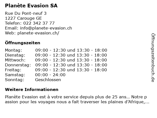 | Öffnungszeiten Planète Evasion SA in Carouge GE anzeigen | |