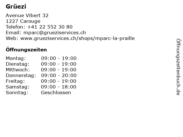 | Öffnungszeiten Grüezi in Carouge anzeigen | |