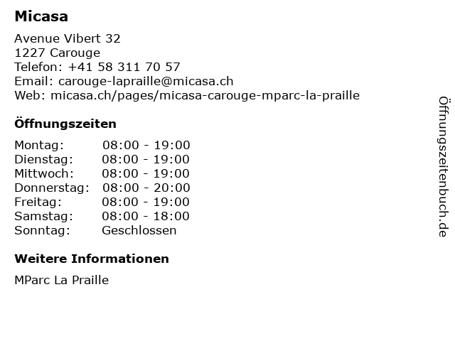 | Öffnungszeiten Micasa in Carouge anzeigen | |
