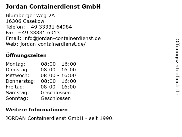 | Öffnungszeiten Jordan Containerdienst GmbH in Casekow anzeigen | |