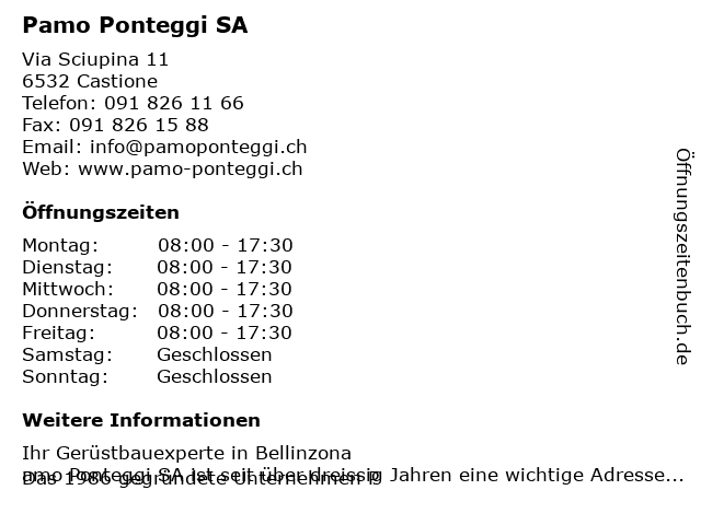 | Öffnungszeiten Pamo Ponteggi SA in Castione anzeigen | |
