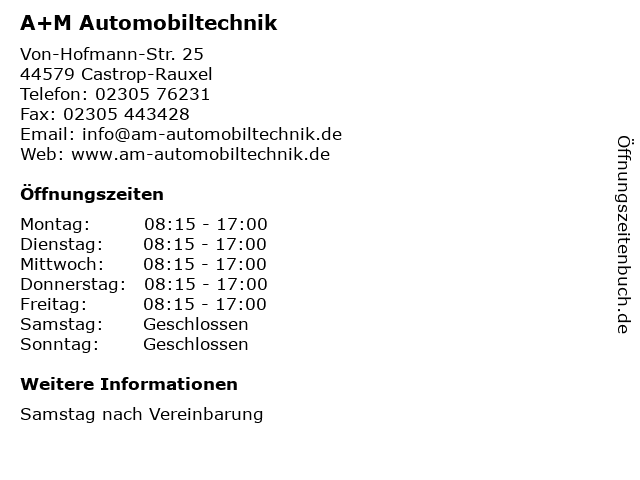 | Öffnungszeiten A+M Automobiltechnik in Castrop-Rauxel anzeigen | |