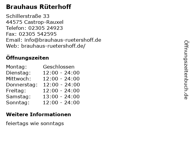 | Öffnungszeiten Brauhaus Rüterhoff in Castrop-Rauxel anzeigen | |