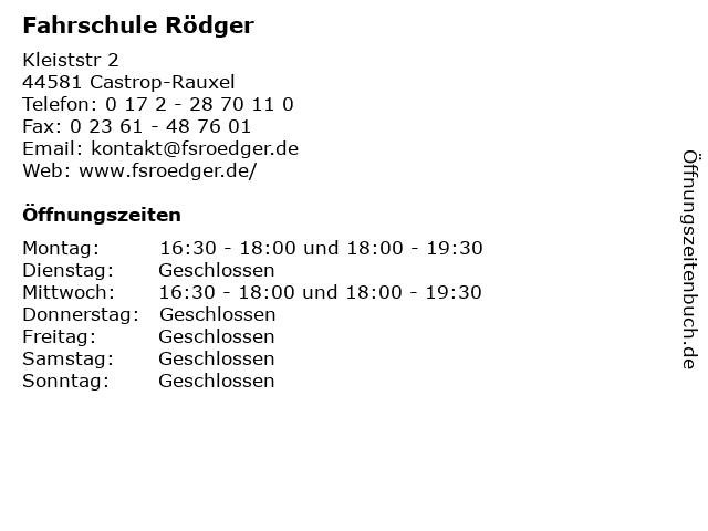 | Öffnungszeiten Fahrschule Rödger in Castrop-Rauxel anzeigen | |