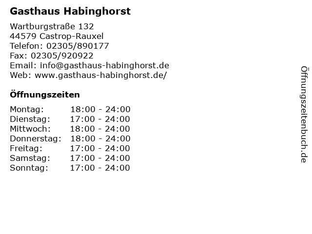 | Öffnungszeiten Gasthaus Habinghorst in Castrop-Rauxel anzeigen | |
