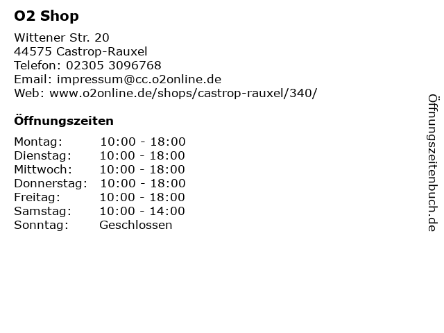 | Öffnungszeiten O2 Shop in Castrop-Rauxel anzeigen | |