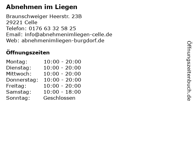 | Öffnungszeiten Abnehmen im Liegen in Celle anzeigen | |