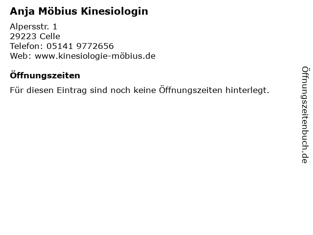 | Öffnungszeiten Anja Möbius Kinesiologin in Celle anzeigen | |