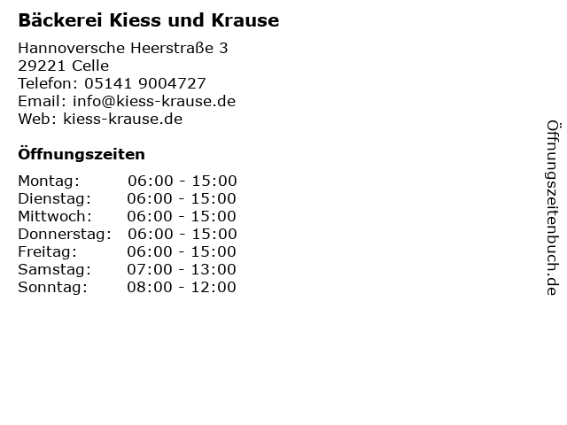 | Öffnungszeiten Bäckerei Kiess und Krause in Celle anzeigen | |