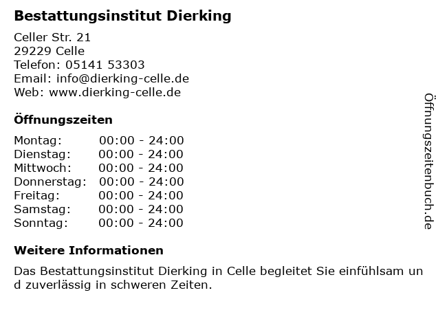 | Öffnungszeiten Bestattungsinstitut Dierking in Celle anzeigen | |