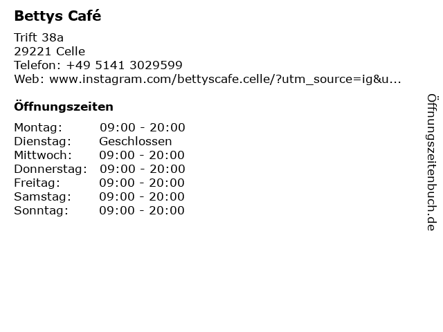 | Öffnungszeiten Bettys Café in Celle anzeigen | |