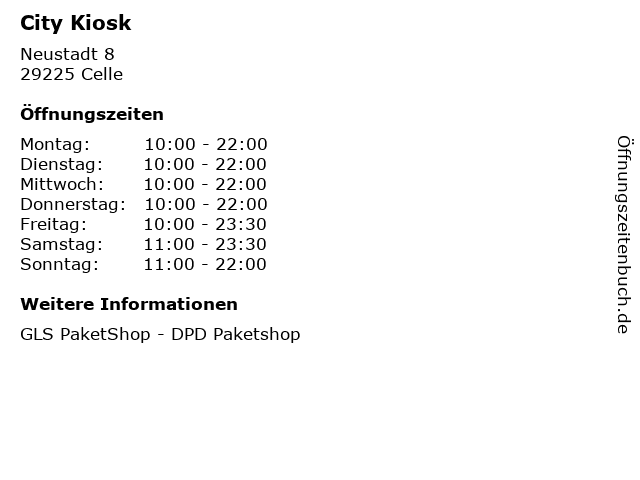 | Öffnungszeiten City Kiosk in Celle anzeigen | |