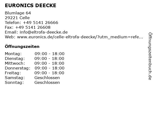 | Öffnungszeiten EURONICS DEECKE in Celle anzeigen | |
