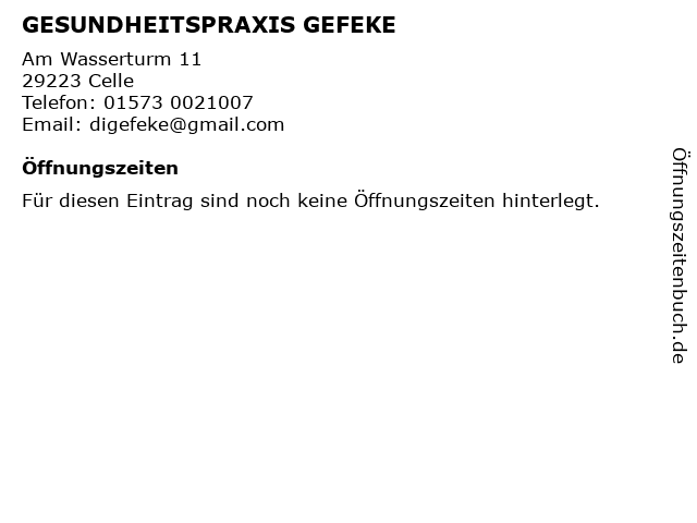 | Öffnungszeiten GESUNDHEITSPRAXIS GEFEKE in Celle anzeigen | |