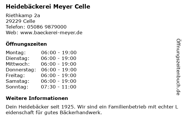 | Öffnungszeiten Heidebäckerei Meyer Celle in Celle anzeigen | |