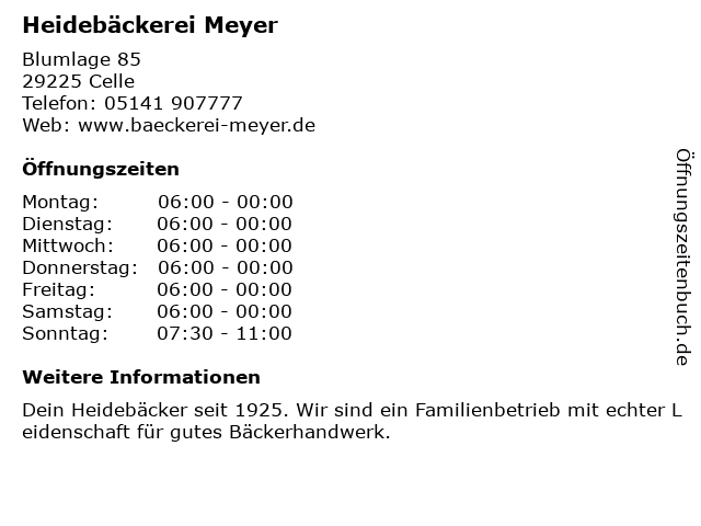 | Öffnungszeiten Heidebäckerei Meyer in Celle anzeigen | |