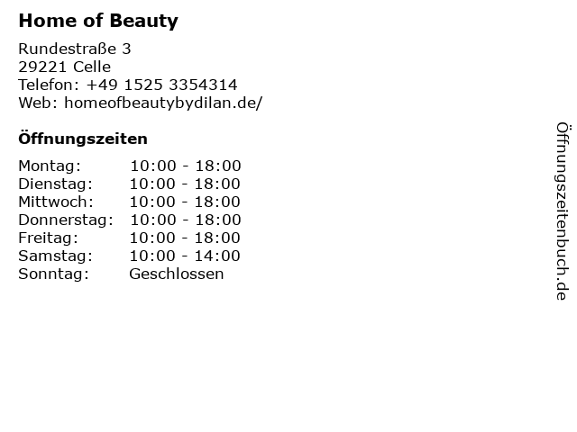 | Öffnungszeiten Home of Beauty in Celle anzeigen | |
