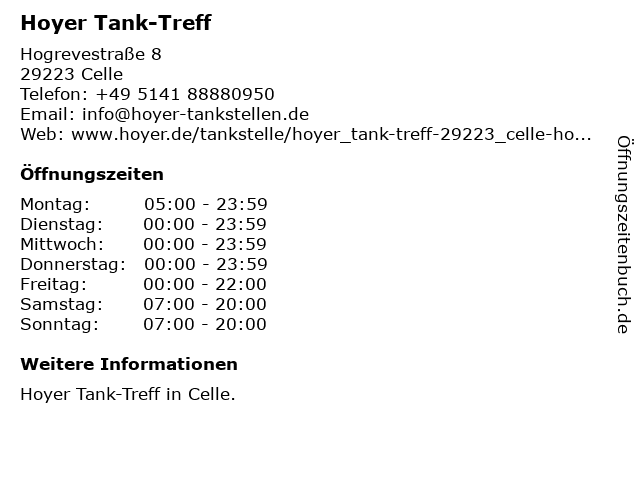| Öffnungszeiten Hoyer Tank-Treff in Celle anzeigen | |