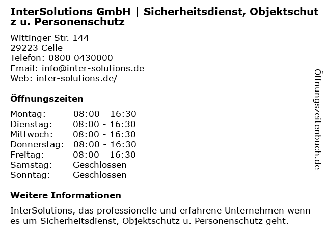 2 easy-trans e.K. Chauffeurdienst, VIP- Service & Personenschutz (Entfernung: 17,27 km) Am Nordberg 12, 30938 Burgwedel 3 Waffensachkunde Akademie Niedersachsen -Verwaltungsanschrift- (Entfernung: 2,20 km) Telefunkenstraße 8, 29223 Celle 6 DB-Services Sicherheitsdienst im Hbf - Hannover (Entfernung: 37,10 km) Ernst-August Platz 1, 30159 Hannover |