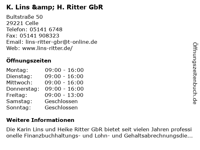 | Öffnungszeiten K. Lins & H. Ritter GbR in Celle anzeigen | |