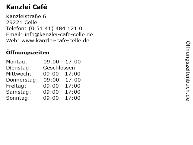 | Öffnungszeiten Kanzlei Café in Celle anzeigen | |