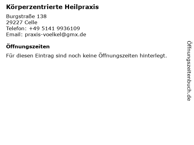 | Öffnungszeiten Körperzentrierte Heilpraxis in Celle anzeigen | |