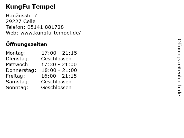 | Öffnungszeiten KungFu Tempel in Celle anzeigen | |