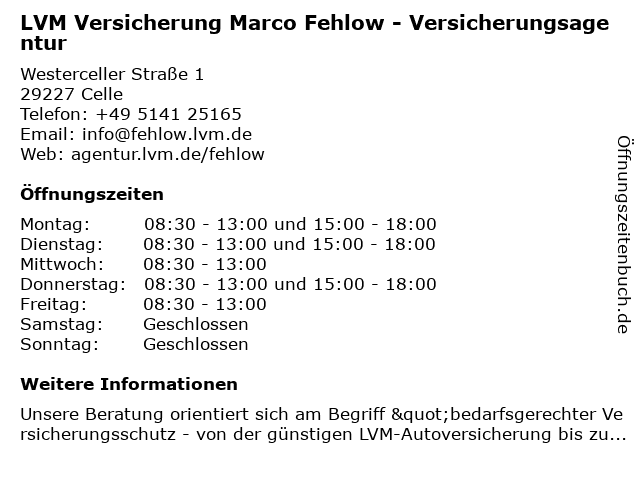 4 LVM Versicherung -Versicherungsagentur Frank Welschhoff (Entfernung: 2,29 km) Bergstr. 25, 29221 Celle 6 |
