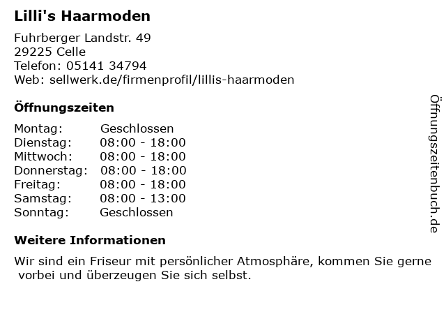 | Öffnungszeiten Lilli's Haarmoden in Celle anzeigen | |