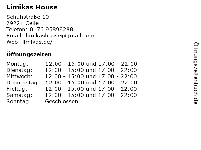 | Öffnungszeiten Limikas House in Celle anzeigen | |