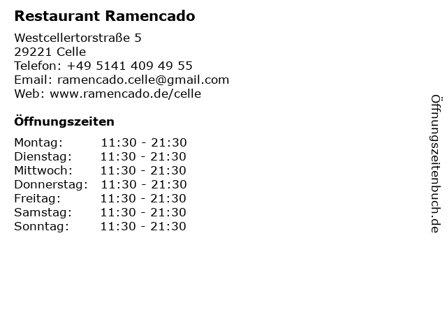 | Öffnungszeiten Restaurant Ramencado in Celle anzeigen | |