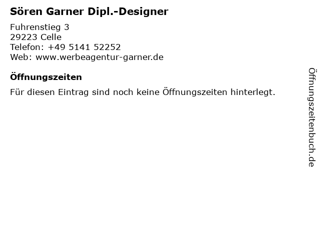| Öffnungszeiten Sören Garner Dipl.-Designer in Celle anzeigen | |